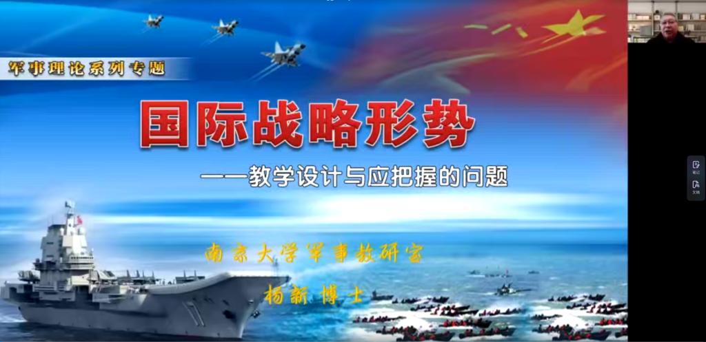 11日,南京大学杨新教授做了《国际战略形势教学设计与应把握的问题》专题讲座。杨教授从《国际战略形势》课教学框架示例、如何备好讲好国家安全理论课、如何提升军事理论素养和讲好军事理论课要把握的问题四个方面做了授课。最后还给大家推荐了很多有价值的参考书籍。