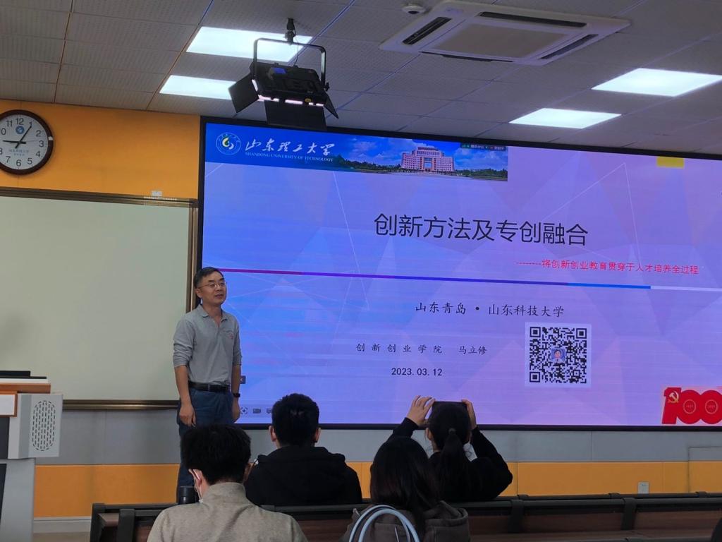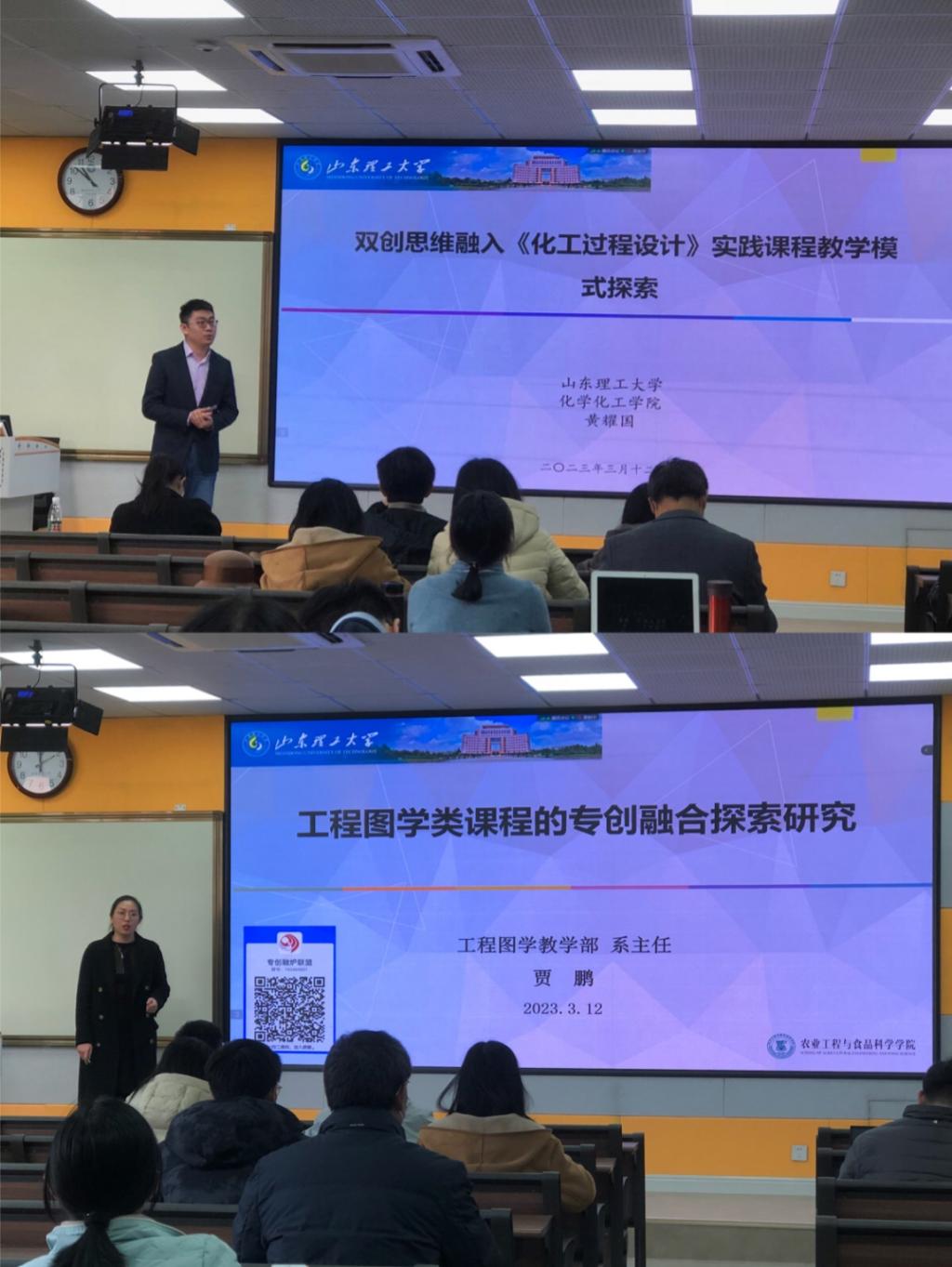 随后,马立修以《创新方法与专创融合——将创新创业教育贯穿于人才培养全过程》为主题的讲座,从宏观介绍了创新方法融入专业课程的意义和途径;山东理工大学化工公司黄耀国、工程图学教学部贾鹏分别以《双创思维融入<化工过程设计>实践课程教学模式探索》、《工程图学类课程的专创融合探索研究》为题从课程设计的实际操作层面进行了分享。