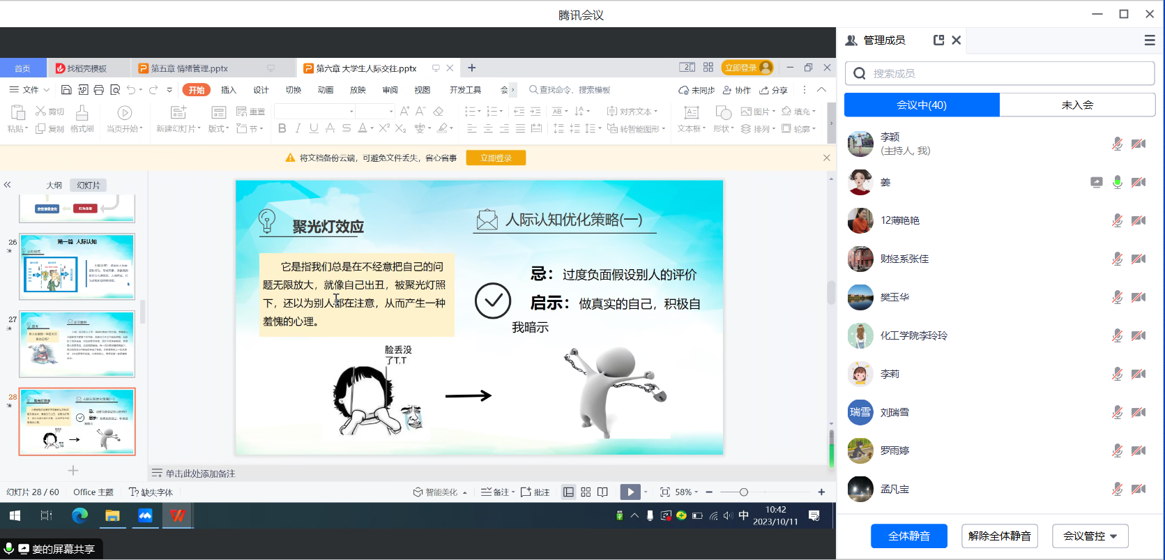 姜振丽老师分享了《第六章 老员工人际交往》的内容。姜老师首先强调了人际交往在老员工活中的重要性。她指出,良好的人际关系不仅能够帮助我们更好地适应老员工活,还有助于个人成长和职业发展。然后,姜老师详细介绍了老员工如何建立和维护健康的人际关系。