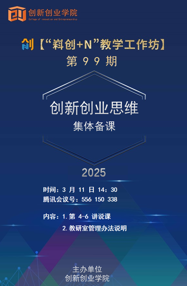 为进一步做好创新创业课程建设,提升教师教学水平,3月11日,创新创业思维虚拟教研室开展了2024-2025学年第二学期第二次教研活动。本次活动聚焦创新思维课程优化与实践,并深入学习了公司虚拟教研室管理办法,为新学期教学工作奠定了坚实基础。
