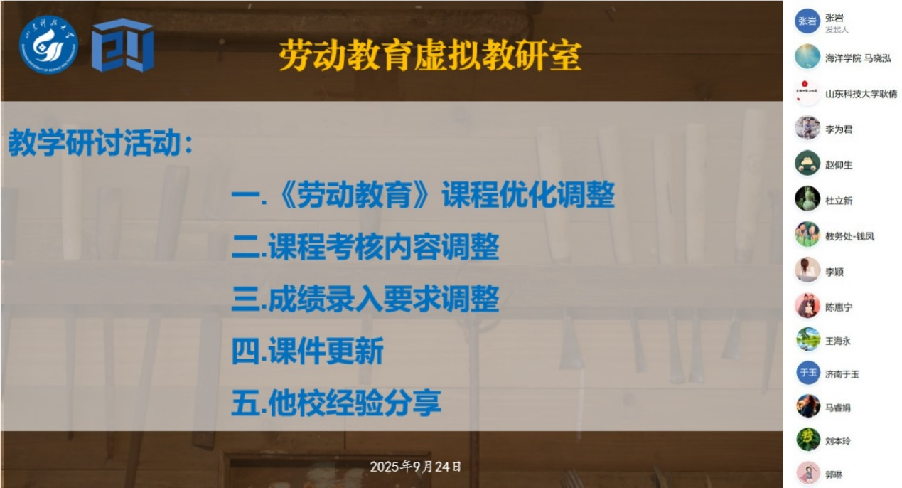 活动伊始,张岩就本学期劳动教育课程的考核要求进行了详细说明。一是本学期《劳动教育》课程进行了优化调整,划分为《劳动教育》和《劳动实践》两门课程,旨在引导员工投入更多有效时间,深化劳动体验与认知。二是介绍了课程考核内容的革新,强调理论课要侧重于通用劳动科学知识,深刻理解马克思主义劳动观和社会主义劳动关系。三是针对成绩录入环节,提醒各位教师严格按照要求在学习通中设置成绩权重,确保教学管理的严谨性。四是劳动教育课件全面更新,新版课件根据最新政策导向与产业变化进行了修改,旨在为教师教学提供更有力的支撑,为员工带来更优质的学习体验。